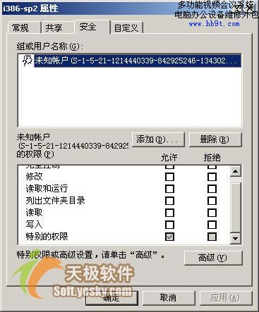 2、右鍵單擊原來設(shè)為專用的文件夾,如“i386-sp2”,從彈出菜單中選擇“屬性”,這時(shí)會(huì)看到在對(duì)話框中多出一個(gè)“安全”選項(xiàng)卡。可以看到這里有一個(gè)未知帳戶,這應(yīng)該就是原來XP系統(tǒng)中的那個(gè)帳戶吧。這個(gè)帳戶是能夠訪問該文件夾的,可問題是我們現(xiàn)在已經(jīng)不能使用這個(gè)帳戶。所以要另想辦法。