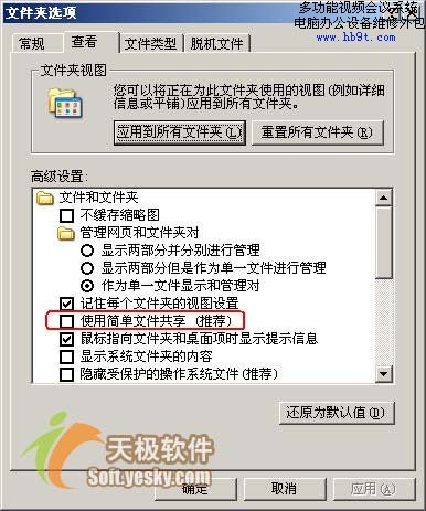 1、以具有管理員權(quán)限的用戶登錄XP,在XP中打開資源管理器,選擇菜單“工具|文件夾選項(xiàng)”,打開“文件夾選項(xiàng)”對(duì)話框。在對(duì)話框中單擊“查看”選項(xiàng)卡,取消復(fù)選框“使用簡單共享”。