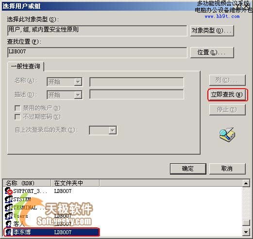 然后在“選擇用戶或組”對(duì)話框中單擊“高級(jí)”按鈕,再單擊“立即查找”按鈕,這時(shí)就會(huì)在下方列出本機(jī)中的用戶或組。選擇要給予權(quán)限的用戶。