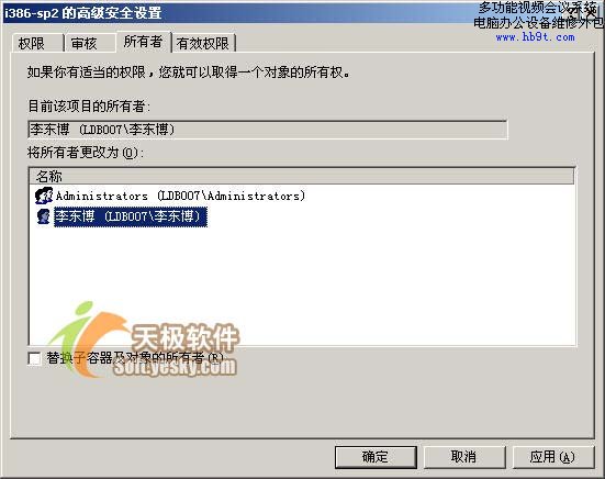 3、單擊圖2所示對(duì)話框中的“高級(jí)”按鈕,彈出“i386-sp2的高級(jí)安全設(shè)置”對(duì)話框,顯示目前該項(xiàng)目的所有者為剛才看到的未知帳戶。選擇“將所有者更改為”下方的用戶,比如筆者現(xiàn)在使用的用戶名稱,然后單擊“應(yīng)用”按鈕,所有者就改變?yōu)楝F(xiàn)在用戶了,如圖3所示。