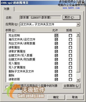 5、連續(xù)單擊兩次“確定”按鈕,直到出現(xiàn)“i386-sp2的權(quán)限項(xiàng)目”對(duì)話框。在“權(quán)限”中的“完全控制”右側(cè)選擇“允許”復(fù)選框,則就會(huì)取得對(duì)該文件夾所有的控制權(quán)。單擊“確定”按鈕。