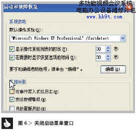 當(dāng)Windows XP 與其他Windows共存時(shí),每次啟動(dòng)都會(huì)顯示啟動(dòng)菜單,很是麻煩。關(guān)閉啟動(dòng)菜單, 直接進(jìn)入Windows XP的方法是:?jiǎn)螕簟翱刂泼姘?系統(tǒng)/屬性/高級(jí)/啟動(dòng)和故障恢復(fù)/設(shè)置”,進(jìn)入了設(shè)置窗口(如圖6),選擇啟動(dòng)時(shí)的默認(rèn)操作系統(tǒng)為XP,顯示啟動(dòng)菜單的時(shí)間為0;如果你暫時(shí)不用或隱藏另一個(gè)操作系統(tǒng),也可以取消“顯示操作系統(tǒng)列表時(shí)間”前的小勾。