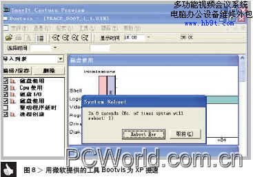 微軟提供的工具Bootvis(下載地址www.skycn.com/soft/8123">http://www.skycn.com/soft/8123.html)可以為XP啟動(dòng)提速,方法是:運(yùn)行Bootvis,單擊“工具/Options”,切記要選擇安裝時(shí)的路徑(比如D:\ProgramFiles/Bootvis),單擊“Save”保存;再單擊“跟蹤/Next Boot”,彈出一個(gè)“TraceRepetitions”重復(fù)追蹤對(duì)話(huà)框,單擊“OK”按鈕,XP 會(huì)重新啟動(dòng)并記錄啟動(dòng)資料、生成 BIN 文件;接下來(lái)會(huì)重新彈出BootVis軟件界面,在菜單“file/open”中打開(kāi)BIN 文件,選擇菜單中的“跟蹤/Optimize System”,系統(tǒng)會(huì)提示你是否重新啟動(dòng),選擇啟動(dòng)(如圖8,注意:重啟登錄后什么都不要做),過(guò)段時(shí)間則會(huì)自動(dòng)彈出一個(gè)對(duì)話(huà)框,上面顯示系統(tǒng)分析等提示信息,分析完畢以后,XP 的啟動(dòng)速度就會(huì)明顯提高。