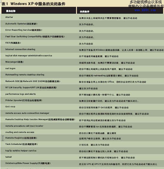 注意:有些服務(wù)是XP必需的,不能關(guān)閉,否則會(huì)造系統(tǒng)崩潰,表1 中是一些服務(wù)的關(guān)閉條件。