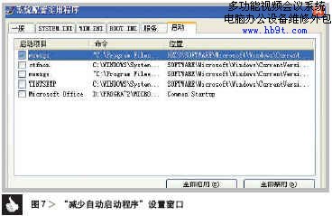 選擇“開(kāi)始/運(yùn)行”,鍵入“msconfig”啟動(dòng)“系統(tǒng)配置實(shí)用程序”,進(jìn)入“啟動(dòng)”標(biāo)簽(如圖7),其中列出了系統(tǒng)啟動(dòng)時(shí)加載的項(xiàng)目及來(lái)源,如果不希望它自動(dòng)加載,清除項(xiàng)目前的復(fù)選框即可,注意:不確定的程序不可以亂關(guān), 以免造成Windows 錯(cuò)誤。