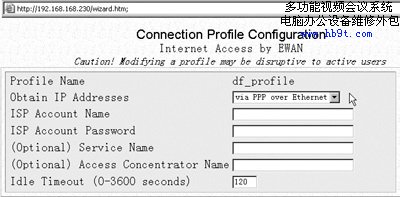 圖6 在Connection Profile Configuration頁(yè)面,我們可以選定寬帶網(wǎng)的類型,一般ADSL選擇via PPP over Ethernet,而Cable或者FTTB選擇via DHCP。如果ISP需要輸入用戶名和密碼,我們可以在下面的相應(yīng)位置輸入。